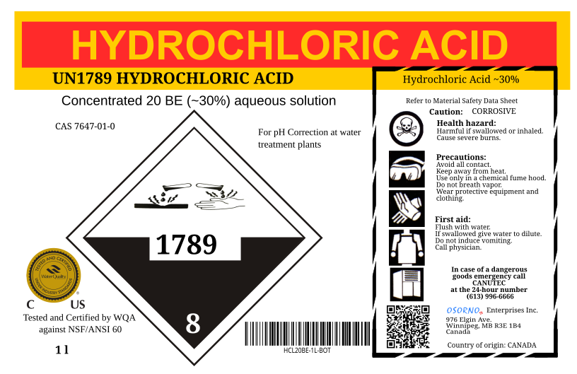 Osorno produces a 20BE (32%) hydrochloric acid solution. Our hydrochloric acid is ANSI 60 certified.